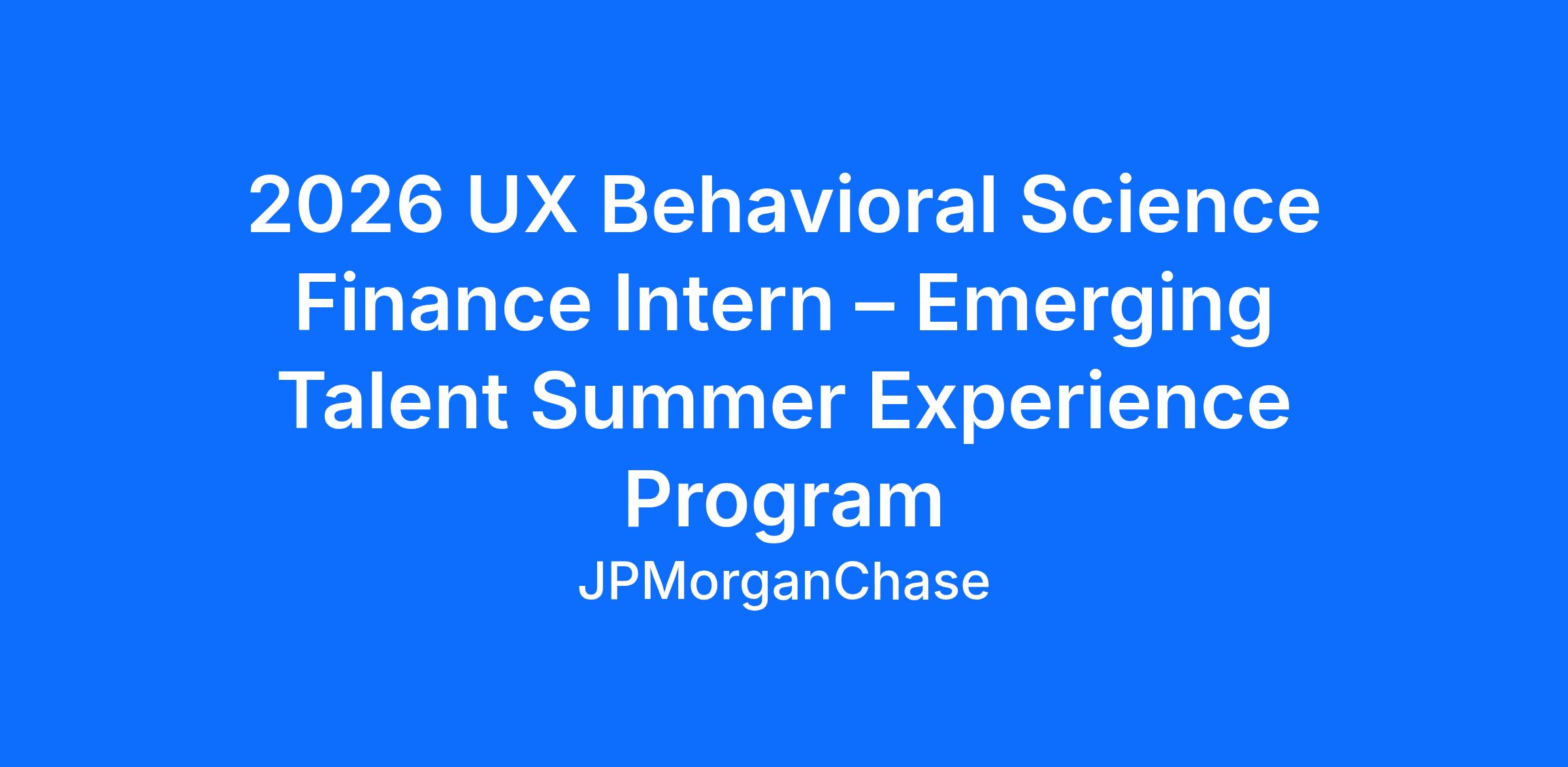 As a 2026 Behavioral Science Finance Intern in JPMorganChase, you will be offered variety, growth, and a great introduction to a range of projects and tasks. You will work along side industry leaders in our UX Behavioral Science teams and gain insight that few other firms can match.