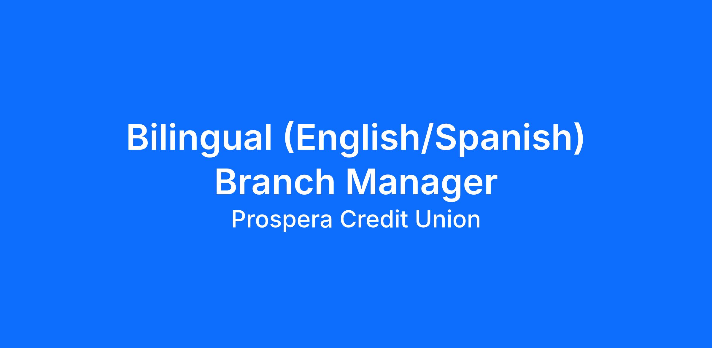 Juntos abrimos las puertas de oportunidades para nuestra comunidad! Imagine being able to get answers to your banking and lending questions from someone who speaks the same language as you do. Or, the opposite, not being able to get the help you need to meet your financial goals. At Prospera Credit Union, we want members of all languages to feel valued and find their path to financial success by working as our Bilingual English/Spanish Branch Manager.