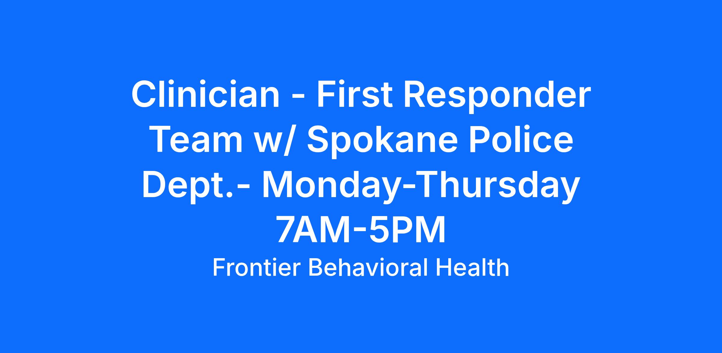 The clinician is a member of a co-deployed team with the Spokane Police Department. Services are provided to individuals and families of all ages. The primary goals of the co-deployed teams are to divert individuals from jail, emergency departments and inpatient psychiatric treatment and reduce recidivism of competency evaluation requests.