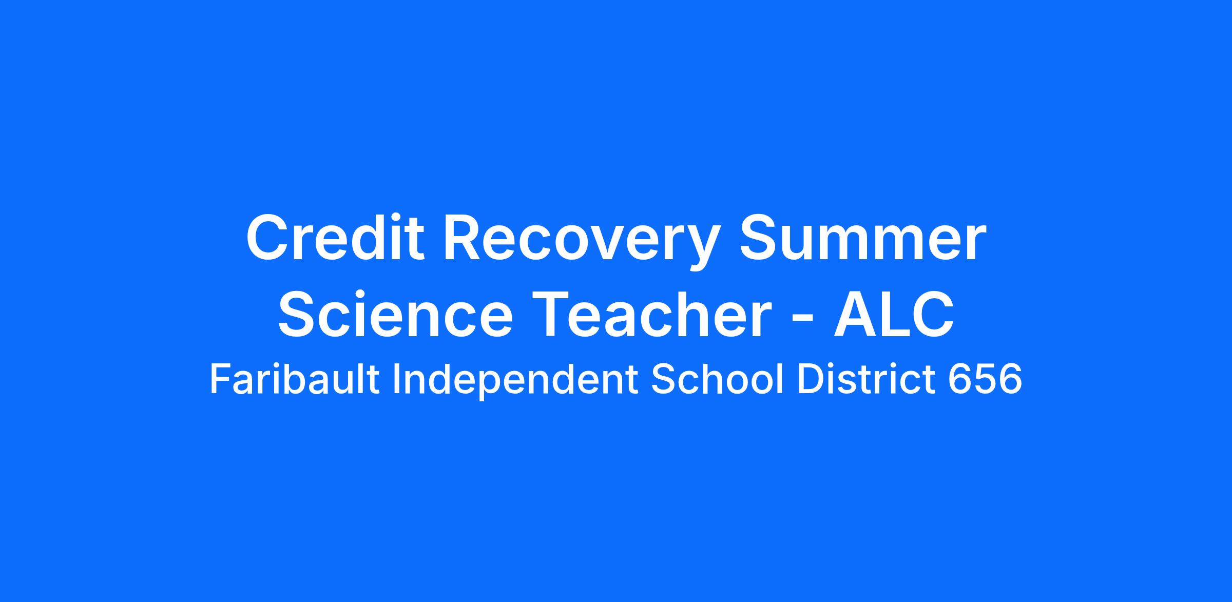 Job Description: The Faribault Area Learning Center is seeking a Science teacher for their summer credit recovery. Candidates will be responsible for creating and teaching Earth and Space Science, Biology, and Chemistry/Physics standards-aligned curriculum to students who have been unsuccessful in completing the course during the school year. Experience in teaching at-risk students is desired.