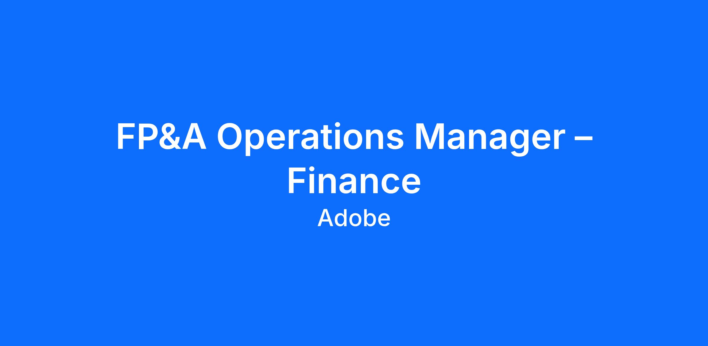 The Financial Planning & Analysis (FP&A) Operations Manager at Adobe plays a meaningful role in driving operational excellence across our FP&A organization. This outstanding opportunity lets you create and manage the operational rhythm for three-month and year-long planning cycles. It ensures clarity, accountability, and smooth collaboration across functions. You will work closely with Finance leadership, FP&A teams, and partners to streamline processes, improve communication, and support high-quality, data-informed decision-making in a world-class environment. This role thrives in a fast-paced, evolving setting and requires sharp intuition for business, critical thinking, and excellent program management skills. The ideal candidate is comfortable with ambiguity, proactive in driving momentum, and skilled at fostering leadership alignment through influence rather than proximity.