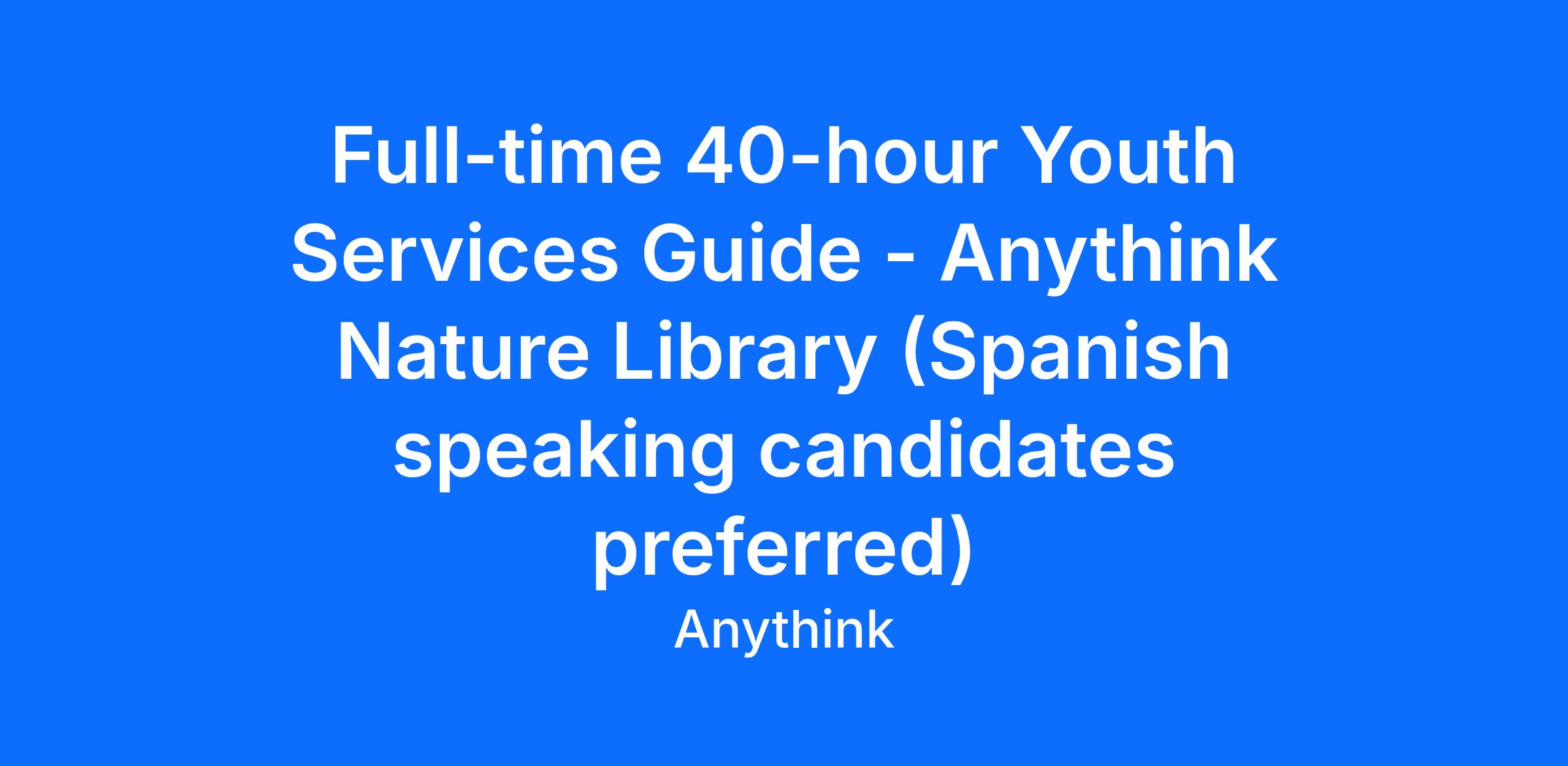 At Anythink, we believe that everyone is creative, and that creativity comes in many forms. We are guided by the philosophy that people thrive when they discover and follow their passions, collaborate with others and become creators. You are equally as comfortable leading a story time audience through a song as you are with supporting an all-ages group with finding wonder in the natural world as you explore nature-based learning activities. You are weather resistant and love nature like no others; you are prepared for bugs, critters, and uncommon temperatures during your workday. As a Guide, you will design informal learning opportunities in unique spaces, both indoors and outdoors, that create magical, transformative experiences for our youngest customers, with an emphasis on children, teens, and families in a growing community. If you are a person with knowledge and experience with children's collections, innovative programming and a friendly and approachable style, being a Youth Services Guide at Anythink Nature Library could be your dream job.