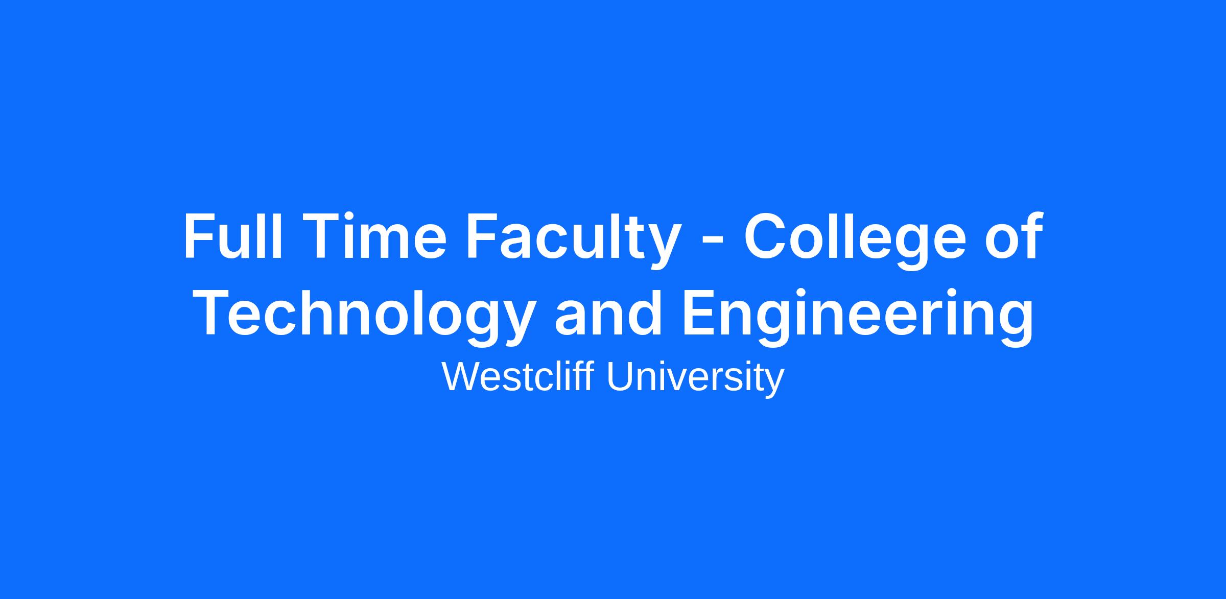Westcliff University is seeking qualified candidates for the role of a full-time College of Technology and Engineering faculty member to support its mission, core values, and student success. We are a forward-thinking, student-centric, quality-driven higher education institution. Our goal is to hire, develop, and elevate full-time faculty who exemplify these values.