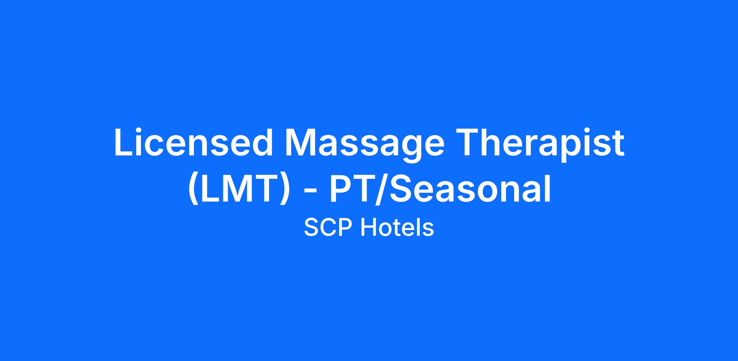 The Licensed Massage Therapist shall strive to provide exceptional service to both internal and external guests at all times. They will be responsible for exemplifying the SCP’s Culture & Core Values.