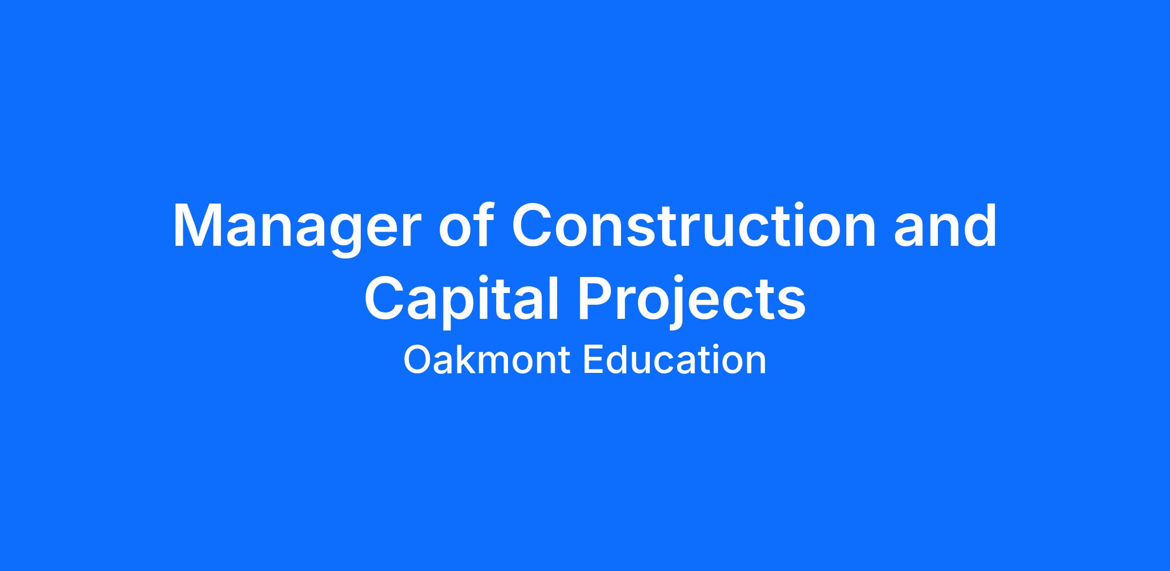The Manager of Construction and Capital Projects leads the day-to-day execution of Oakmont’s capital construction and renovation projects and supports facilities operations across the network. Reporting to the Head of Facilities and Capital Project Delivery, this role is responsible for managing project plans, vendor coordination, site oversight, and documentation to ensure projects are delivered on time, on budget, and in alignment with Oakmont standards.