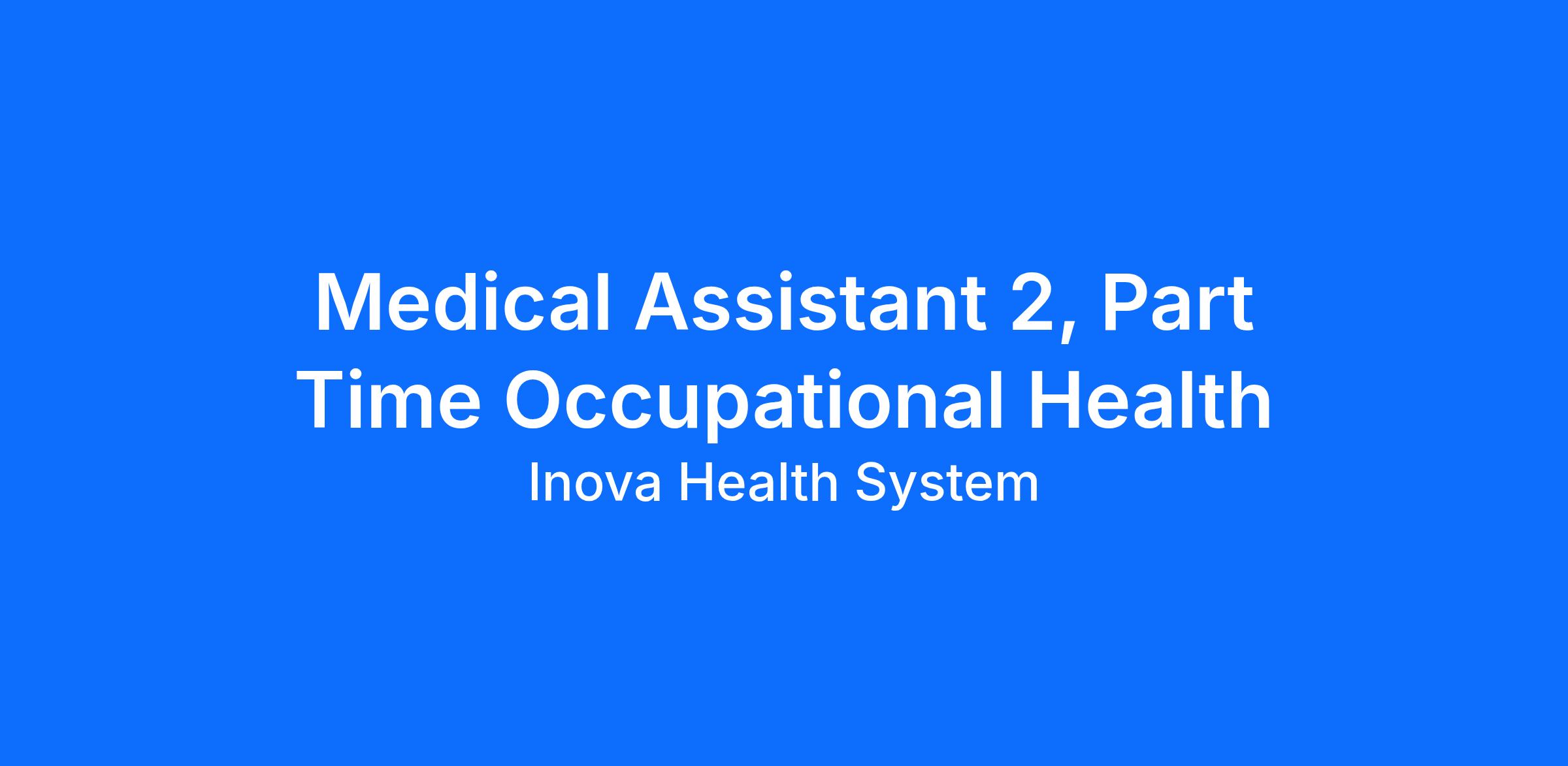 DescriptionInova Occupational Health in Arlington, VA is looking for a dedicated Medical Assistant 2 to join the team. This role will be Part-Time.