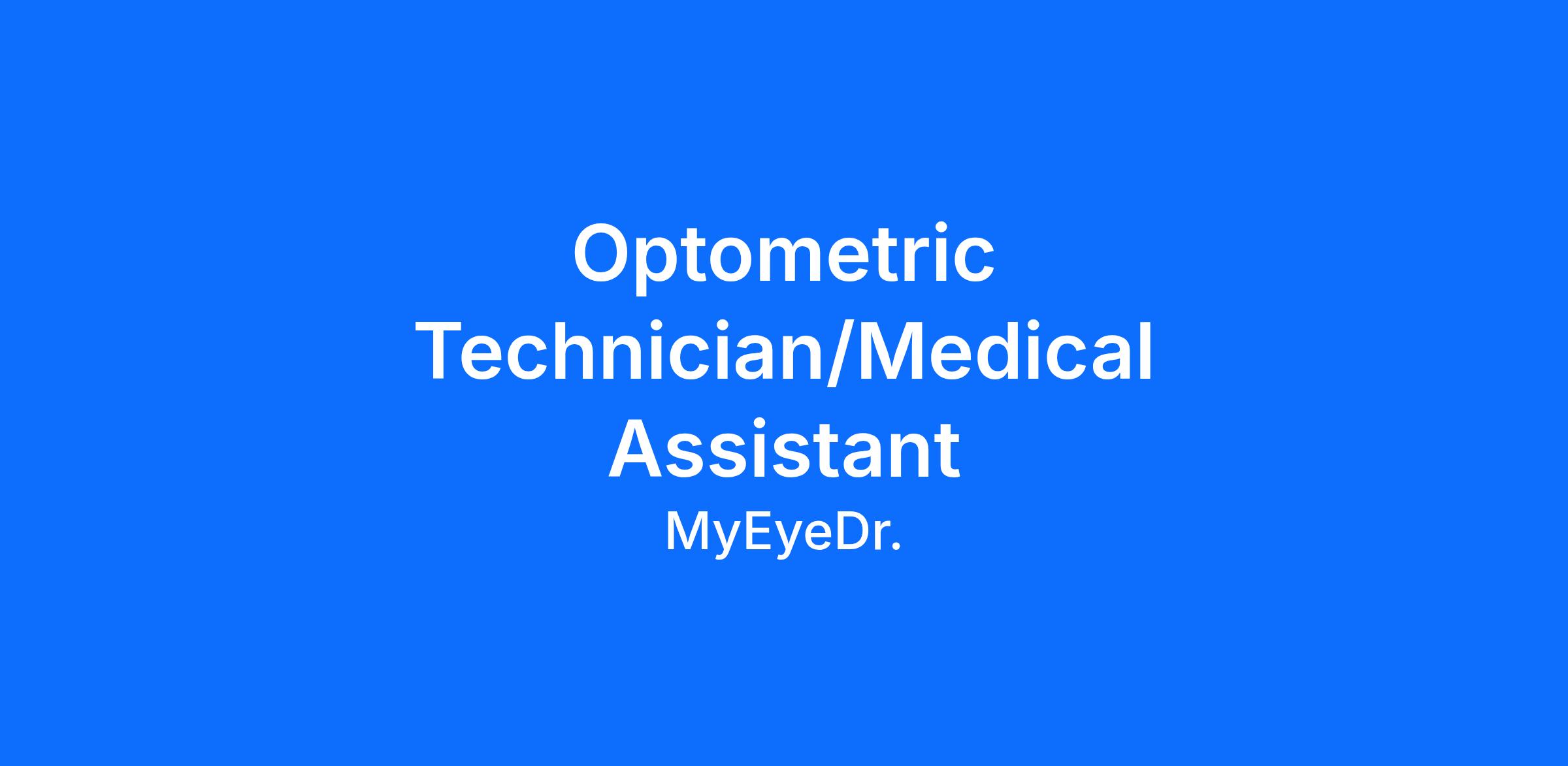 See yourself starting a new career journey? As an Optometric Technician for MyEyeDr. you play an essential role by providing direct support to our Doctors of Optometry in preparing the patient for their visit inclusive of preliminary testing and measurements. No optical experience? No problem! You will be provided training and tools needed to learn about an industry that delivers our patients a best-in-class experience to help them see and live their best lives. Join our team today and help provide the highest quality vision care to our patients. This role reports to the Office General Manager but will directly support our Doctor(s). Some weekend and evenings shifts required.
