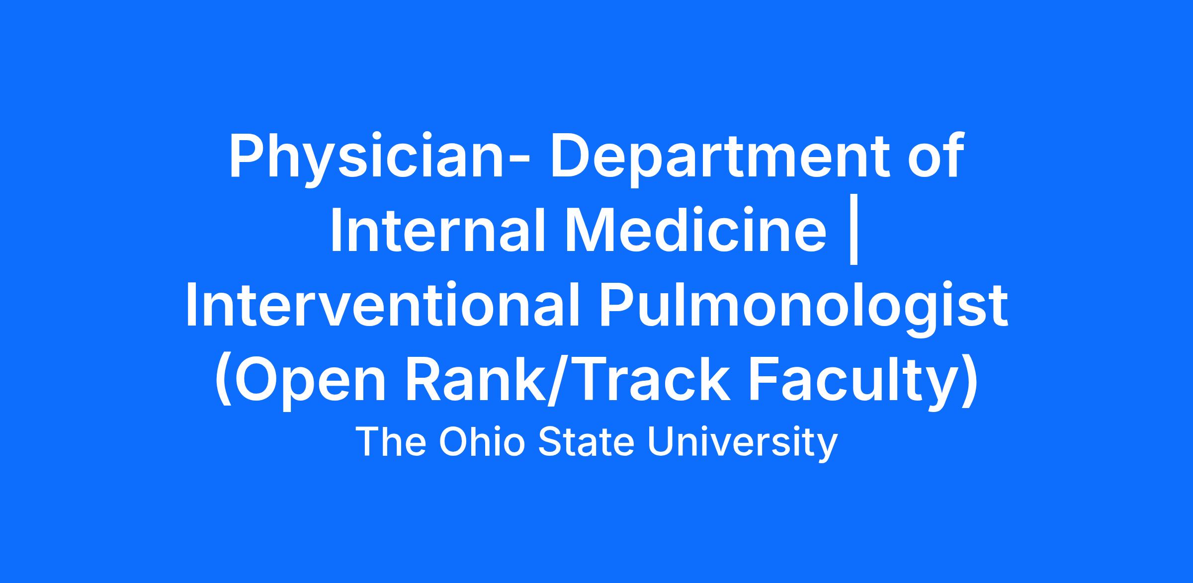 The Ohio State University College of Medicine and the Wexner Medical Center seek an Interventional Pulmonologist to join the Department of Internal Medicine in the Division of Pulmonology, Critical Care, and Sleep Medicine. Academic rank and track commensurate with academic record and experience.