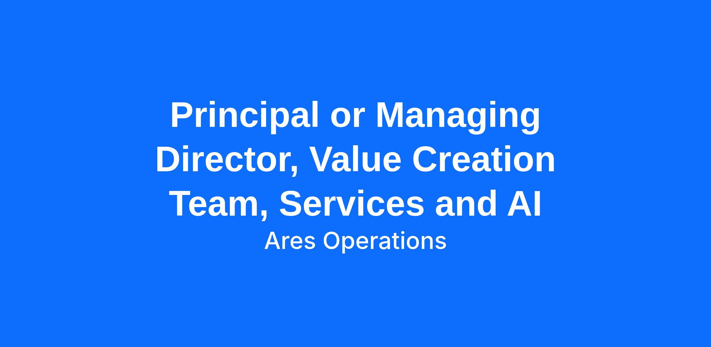 The Principal/Managing Director exists to create value in Ares funds and portfolio companies through AI-driven initiatives. The role is executed through influence and partnership with constituents (deal teams, boards, portfolio company management teams) and trusted third parties, without direct line control, and seeks to tie all activities back to measurable value creation.