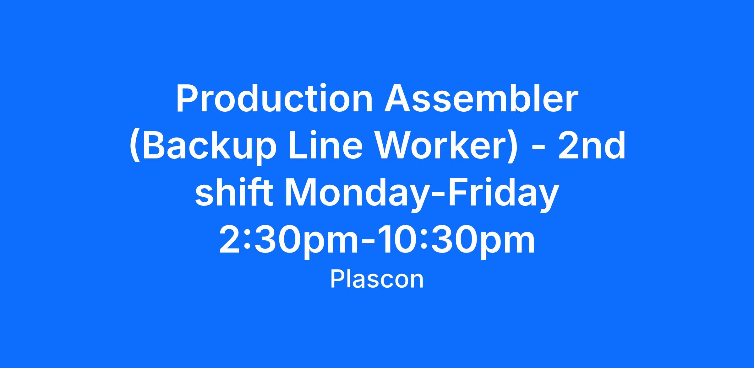 Second shift work schedule is Monday through Friday 2:30 p.m. - 10:30 p.m.