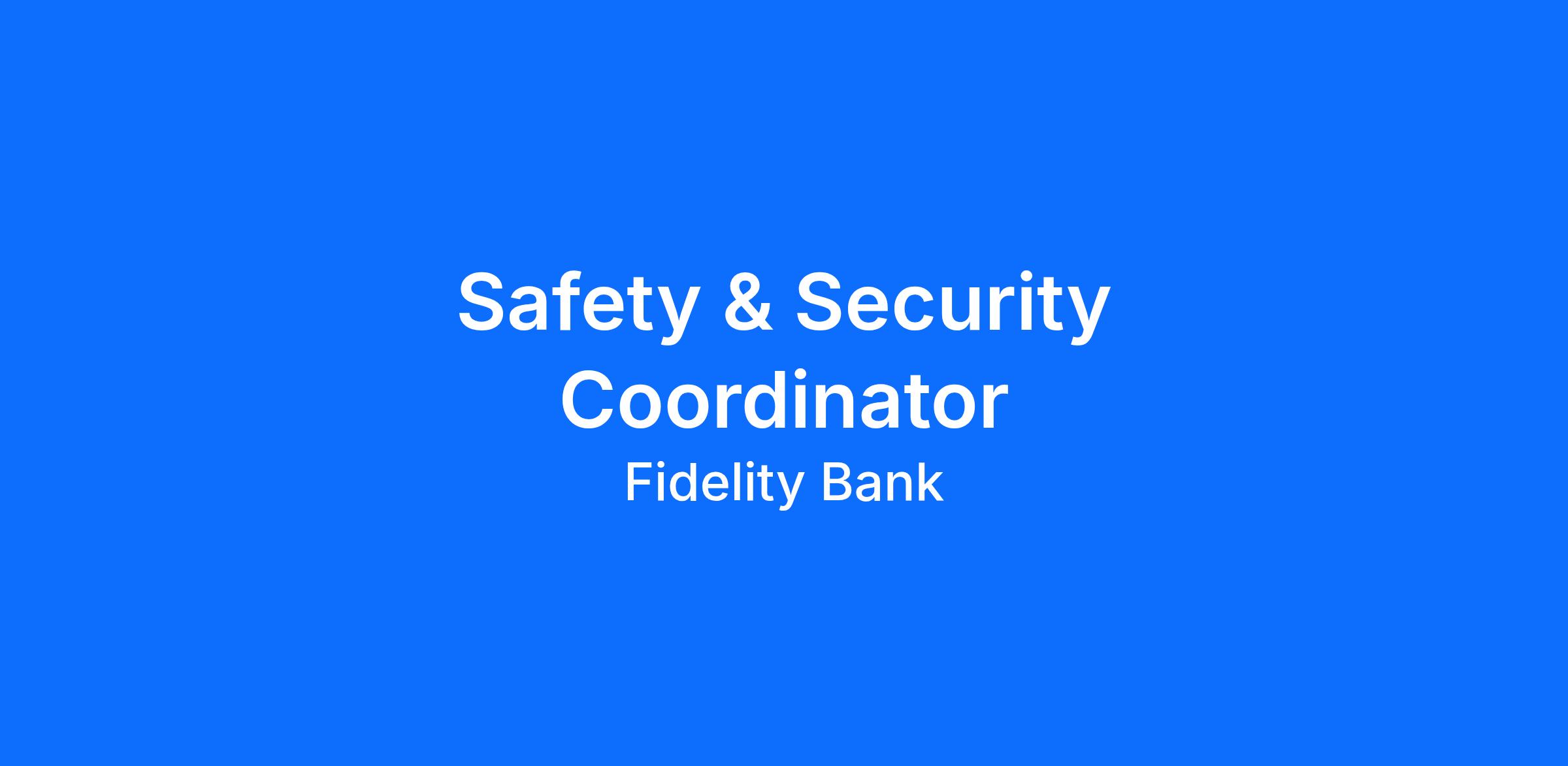Job Overview: The Safety and Security Coordinator will monitor Fidelity Bank’s facilities, assess threats, mitigate risks and equip our employees with the knowledge and resources they need to stay safe.