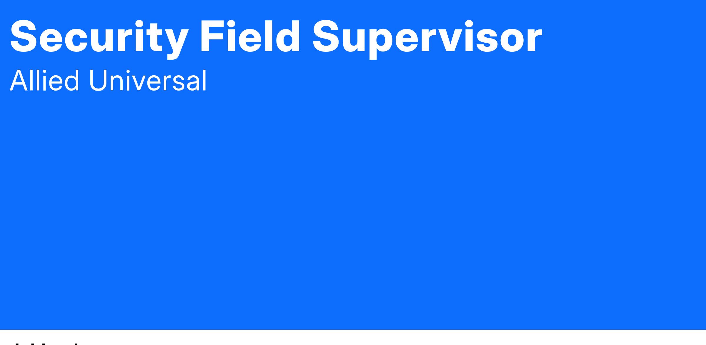 Allied Universal® is hiring a Security Field Supervisor in Rochester, NY. The Field Supervisor supports operations for remotely managed accounts by performing on-site supervision of Security Professionals (SPs) and ensuring site coverage at all times. The Field Supervisor works closely with Operations Managers on a day-to-day basis to supervise remote service delivery.