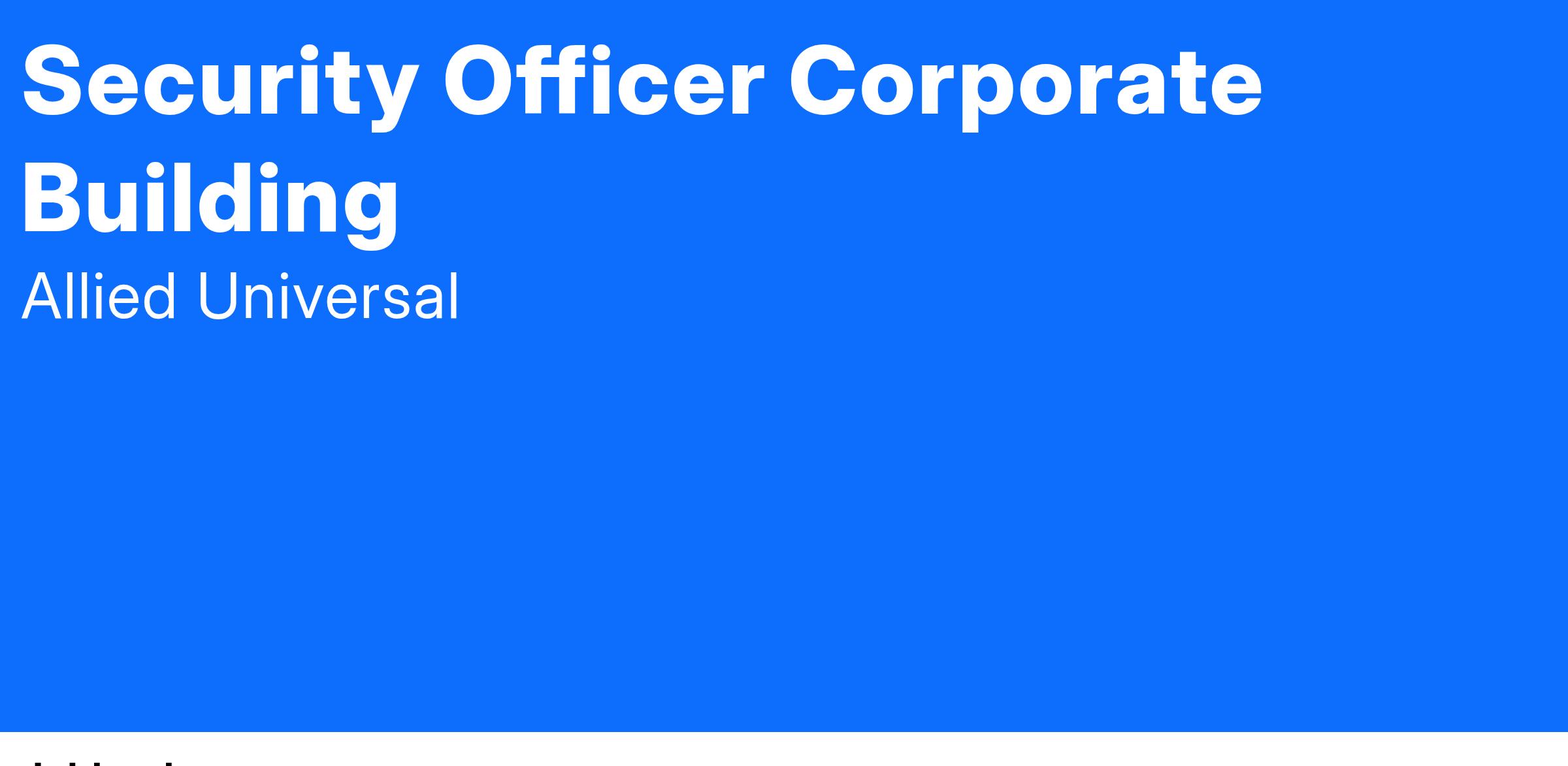 Allied Universal As a Security Officer, you will serve and safeguard clients in a range of industries such as Commercial Real Estate, Healthcare, Education, Government and more.