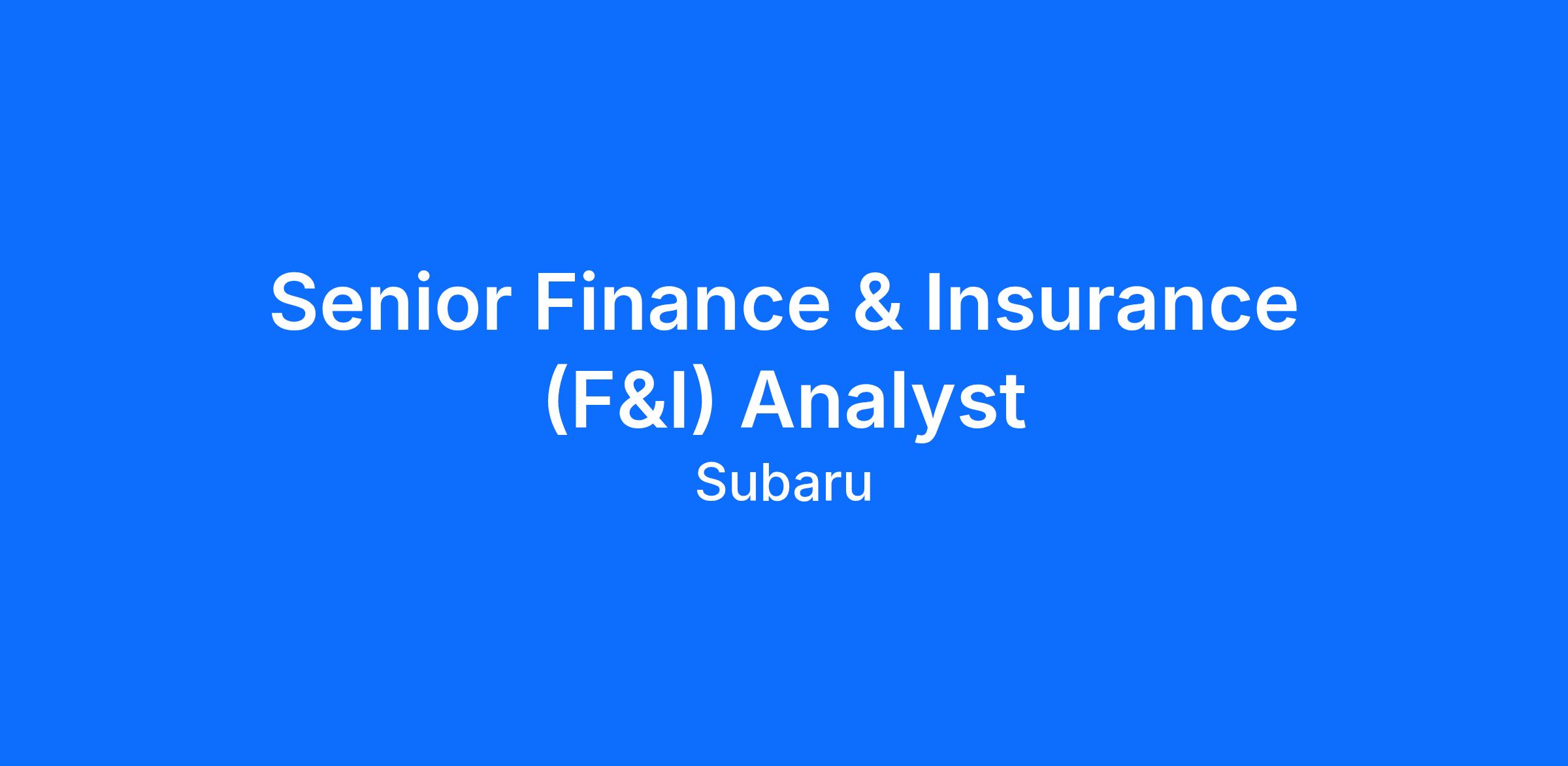 Collaborates with the Finance & Insurance (F&I) Operations and F&I Development Managers with development, marketing, administration, and compliance of all the Subaru F&I products such as Subaru Added Security (SAS) and Subaru Equity Shield (SES). These insurance products are written in partnership with insurance companies, are sold by participating Subaru of America (SOA) retailers, and Guaranteed Asset Protection (GAP) is reinsured through Pleiades Insurance Company, Ltd. (SOA's Captive insurance company). Assists with the insurance compliance for SAS (extended service agreements) in all states.