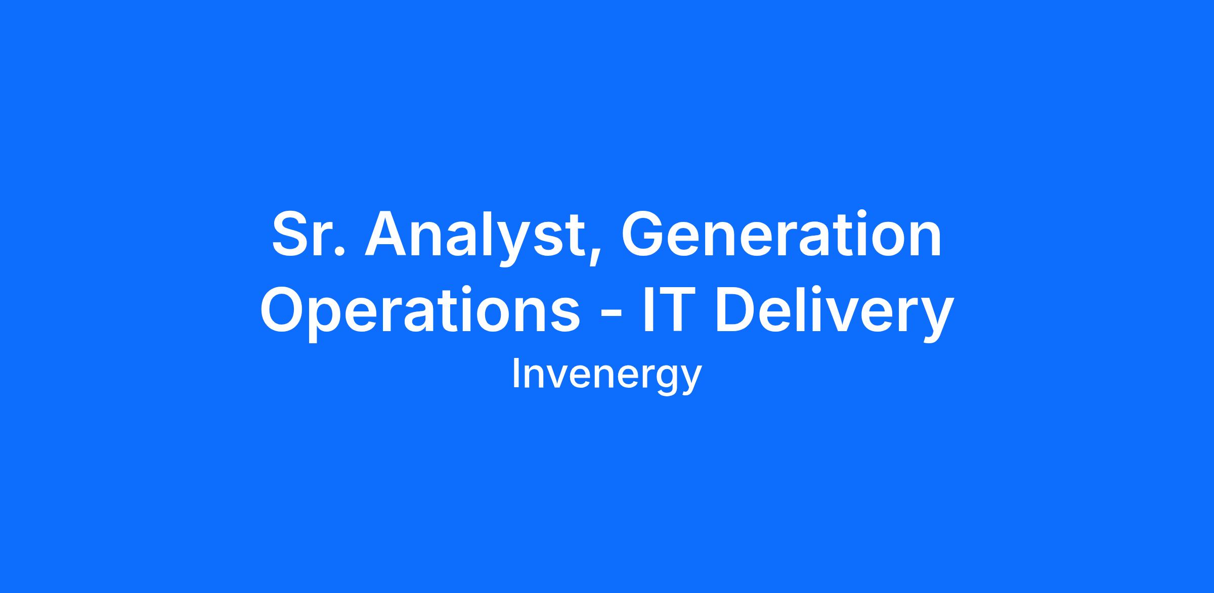 The Senior Analyst, Generation Operations - Delivery will support Invenergy in facilitating the intake, delivery, and operational handover of IT infrastructure and IT business services for existing and new generation sites and businesses. In this role, you will work with a cross-functional team consisting of business stakeholders, IT staff (IT Infrastructure, Service Desk, Information Security, SCADA and IT Business Administration) and third-party customers to design, build, and improve Invenergy technology implementations at generation facilities. The individual will actively contribute to the success of the overall Generation Operations Delivery Program as a senior lead to enable alignment of business requirements with appropriate technology solutions and support.